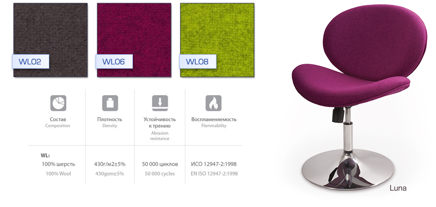 Шерсть является прекрасным материалом для обивки мебели: это экологичный материал, устойчивый к загрязнению. Кроме того данная обивка обладает памятью формы, что позволяет использовать его при обивке мебели сложной формы.